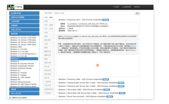 7.在這個(gè)頁面,點(diǎn)擊“操作系統(tǒng)”,里面有各種版本的操作系統(tǒng),比如你要下載windows7,就點(diǎn)擊它,在右側(cè)找到你所需的系統(tǒng)版本,點(diǎn)擊“詳細(xì)信息”,復(fù)制ed2k鏈接,可以使用迅雷、百度網(wǎng)盤離線等工具下載。(建議使用系統(tǒng)版本,win7:Professional(專業(yè)版)、Ultimate(旗艦版),win10:1909以上版本)
