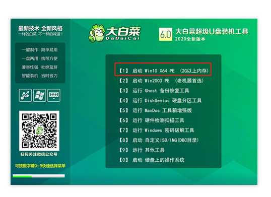 10.進(jìn)入大白菜主菜單后,通過“↑↓”鍵選擇“【1】啟動(dòng)Win10 X64PE(2G以上內(nèi)存)”后回車確認(rèn),成功進(jìn)入winpe。