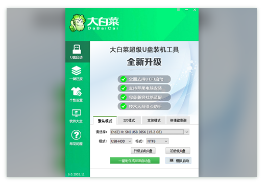 1.下載并安裝好大白菜裝機(jī)版,打開軟件并插入U(xiǎn)盤,選擇“默認(rèn)模式”,點(diǎn)擊需要制作啟動(dòng)的設(shè)備,在模式選項(xiàng)中選擇“USB-HDD”,格式選擇“NTFS”。