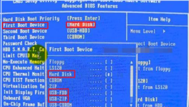 5、返回上一次界面,點(diǎn)擊第一個(gè)啟動(dòng)設(shè)備First Boot Device,選Hard Disk就行了。
