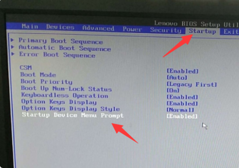 2、進(jìn)入到bios界面中,切換到Startup選項(xiàng)卡,然后進(jìn)入到startup device menu prompt選項(xiàng)。