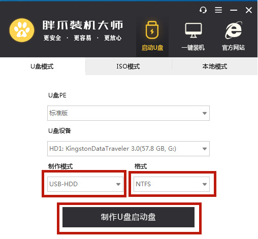 2、插入U(xiǎn)盤,軟件自動(dòng)檢測(cè)到U盤?信息后,將制作模式設(shè)置為“usb-hdd”,格式設(shè)置為“ntfs”,再點(diǎn)擊“制作U盤啟動(dòng)盤”