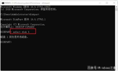 5. 在命令提示符窗口中輸入DISKPART>右側(cè),繼續(xù)輸入命令“select disk 1”后回車(剛剛查看的盤號(hào)是幾,就在select disk 后面輸幾,例如這里是1。)