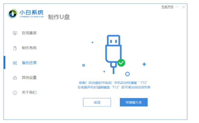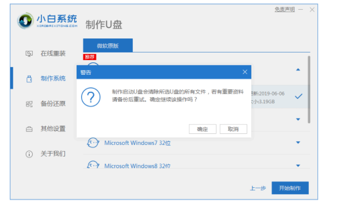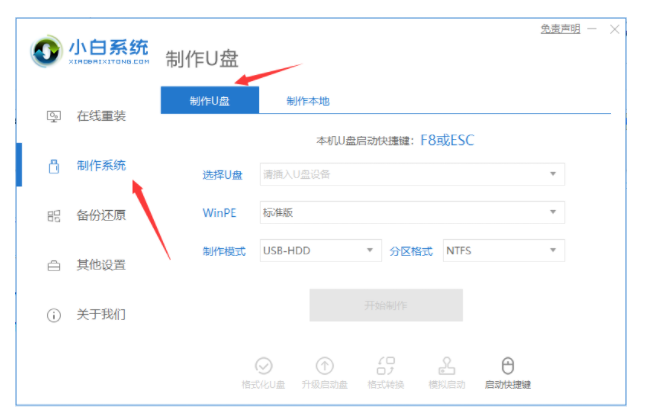 1、下載并運(yùn)行小白一鍵重裝系統(tǒng)軟件,插入U(xiǎn)盤,選擇制作系統(tǒng)里的制作U盤選項(xiàng)。
