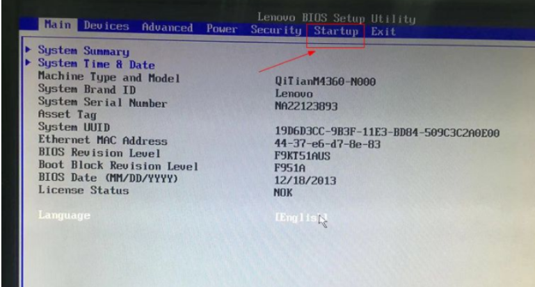 3.進(jìn)入到BIOS頁(yè)面之后,使用鍵盤(pán)的左右方法鍵盤(pán),點(diǎn)擊startup選項(xiàng)即可。