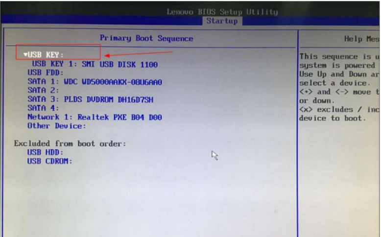 5.然后我們進(jìn)入設(shè)置明細(xì)頁(yè)面,可以通過(guò)按小鍵盤(pán)的“+”和“-”(加減號(hào))來(lái)實(shí)現(xiàn)順序的改變,將usb key 設(shè)置為第一個(gè),有的電腦可以能是"usb HDD".