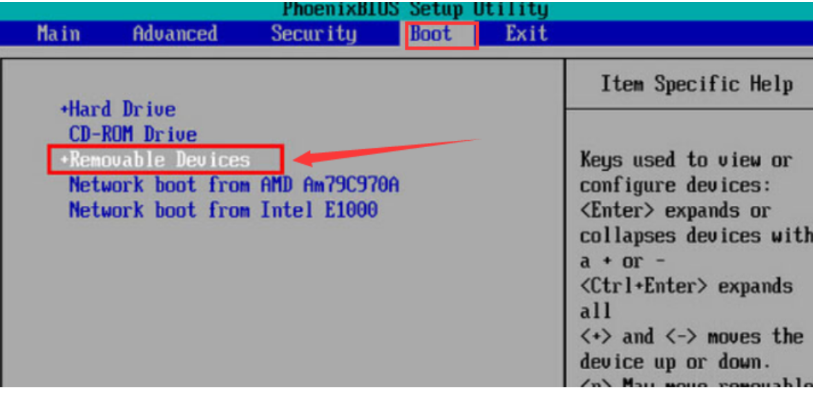 2.把光標(biāo)移動(dòng)到“boot”,找到u盤的選項(xiàng),這里是“removeble device”。