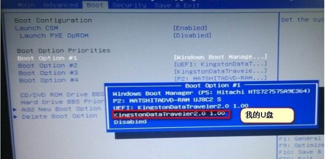 4、在“boot”中找到“bootoption#1“并按回車(chē)鍵。找到u盤(pán)。選擇完后按F10保存退出即可。重啟電腦就可以選擇用u盤(pán)啟動(dòng)啦。