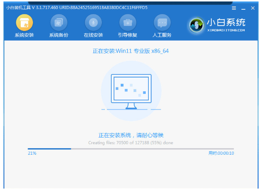 8.進(jìn)入pe系統(tǒng)后,打開(kāi)小白安裝工具選擇要安裝的系統(tǒng)版本,點(diǎn)擊安裝,耐心等待系統(tǒng)安裝。