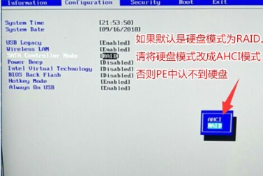 4、再將【configuration】選項(xiàng)下的硬盤模式改為AHCI模式,保存即可;