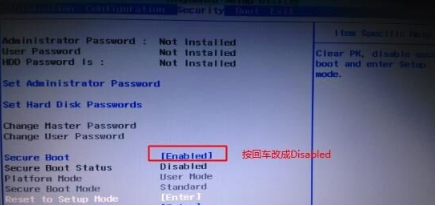 1、重啟電腦時(shí)按F2或(FN+F2)進(jìn)入BIOS,借助方向鍵切換【Security】選項(xiàng)卡下,選擇【Secure Boot】按回車鍵修改為【Disabled】