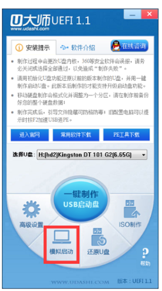 4、進(jìn)入U(xiǎn)大師U盤啟動(dòng)制作工具,選擇模擬啟動(dòng)選項(xiàng)。