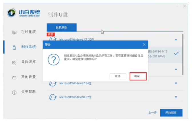 3、此時(shí)會(huì)彈出格式化U盤操作,點(diǎn)擊“確認(rèn)”,等待制作完成之后,重啟電腦。