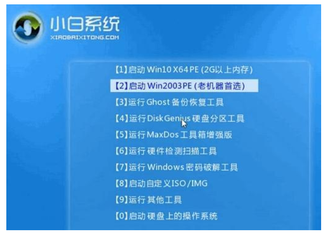 4、在重啟電腦時(shí),選擇U盤啟動(dòng)進(jìn)行電腦啟動(dòng),在進(jìn)入小白系統(tǒng)pe時(shí),選擇選擇第一項(xiàng)“啟動(dòng)win10 x64PE(2G以上內(nèi)存進(jìn)入)”進(jìn)入系統(tǒng)。
