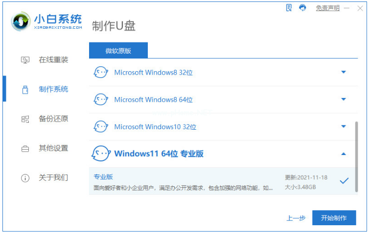 1、首先將U盤插入可以聯(lián)網(wǎng)的電腦,在電腦網(wǎng)上下載安裝并運(yùn)行小白一鍵重裝系統(tǒng),點(diǎn)擊開始制作。