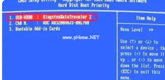 5.進(jìn)入下一個(gè)窗口后,選擇要優(yōu)先啟動的項(xiàng)目,一般是USB-HDD,或U盤名稱,用上下方向鍵選擇項(xiàng)目,用+或-移動到上面,移動后按Enter回車。