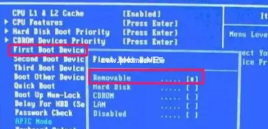6.返回AdvancedBIOSFeatures窗口后,選擇FirstBootDevice,即第一個(gè)啟動盤,選擇Removable或USB-HDD,都是U盤,選擇后回車,最后按F10保存退出就設(shè)置完成啦。