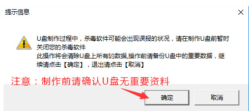4、制作過程中會彈出提示信息,需要清除U盤數(shù)據(jù),請確定備份數(shù)據(jù)或U盤中無重要數(shù)據(jù)后點擊【確定】繼續(xù)制作。