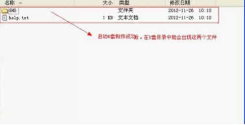 2、耐心等待軟件制作啟動盤完成,制作完成后,程序會彈出制作成功的提示,打開U盤,在根目錄就會看到兩個文件,一個是”GHO文件夾“,一個是”help.txt“文件,這樣U盤就可以作為啟動U盤使用了。
