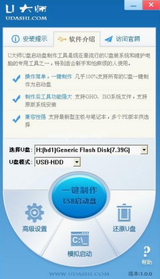 1、安裝完后U大師啟動盤制作工具的主窗口會自動彈出。