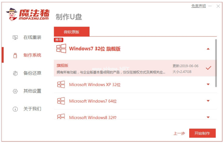 2、選擇需要安裝的win7系統(tǒng),并點(diǎn)擊開(kāi)始制作u盤(pán)啟動(dòng)盤(pán)。