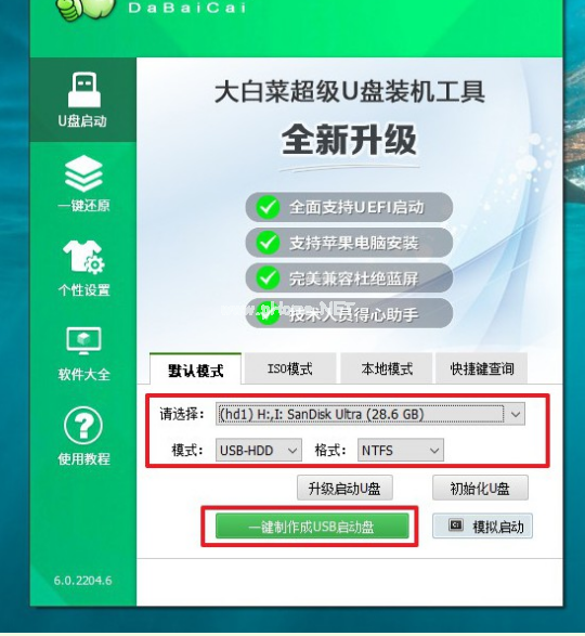 2. 將空白u盤接入電腦,自動識別后,默認USB—HDD和NTFS設置,點擊一鍵制作成u盤啟動盤。