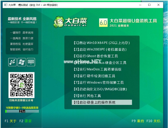 6. 頁面彈出測試畫面,則驗證大白菜u盤啟動盤主菜單則制作成功。