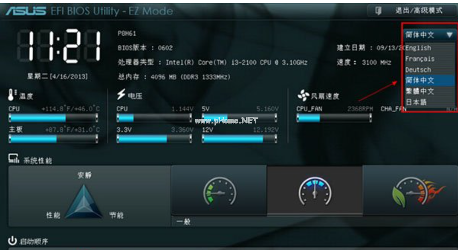 2、此時(shí)就可以進(jìn)入到華碩主板uefi bios界面,然后點(diǎn)擊右上角將文字顯示類型設(shè)置為“簡體中文”模式。