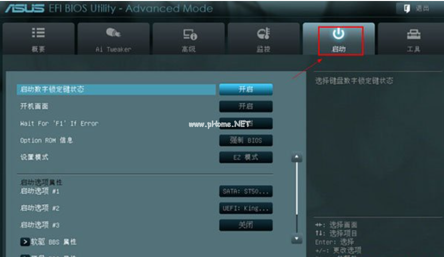 4、接著用鍵盤左右方向鍵切換到“啟動”欄目。