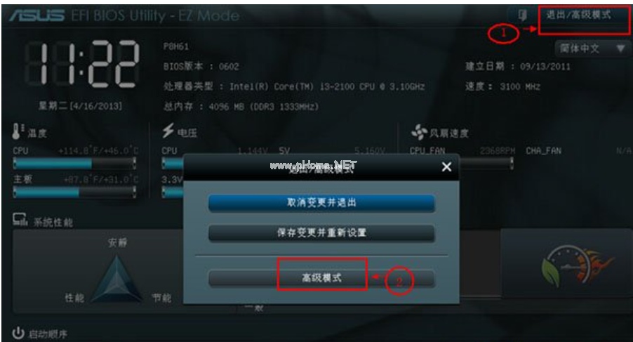3、點(diǎn)擊右上角“退出/高級模式”按鈕,在彈出的窗口中使用上下方向鍵選擇“高級模式”項(xiàng),按回車鍵執(zhí)行。