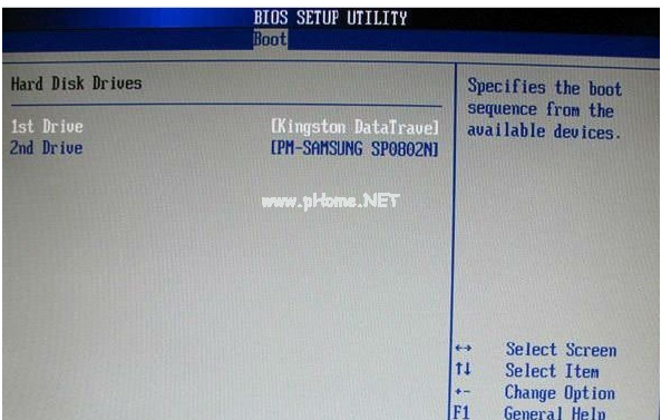 4.硬盤驅(qū)動器“Hard Disk Drives”選擇:選擇U盤為第一啟動設(shè)備“1st Drive”。如果先在“Hard Disk Drives”里面選擇U盤為第一啟動設(shè)備,如圖3-2所示,那么這里就會顯示有U盤,那就選擇U盤為第一啟動設(shè)備,如圖下圖所示。