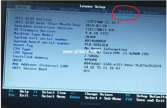 2、小編以聯(lián)想的筆記本為例,(方法都是大同小異),點(diǎn)擊Startup選項(xiàng)卡。