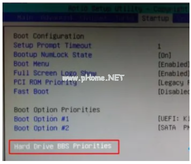 6、如果是以下界面,切換到Boot或Startup,選擇“Hard Drive BBS Priorities,回車
