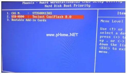 5、選擇USB-HDD按加減號(hào)或F5/F6或PageUP/PageDown,移動(dòng)到第一位置,按F10回車重啟