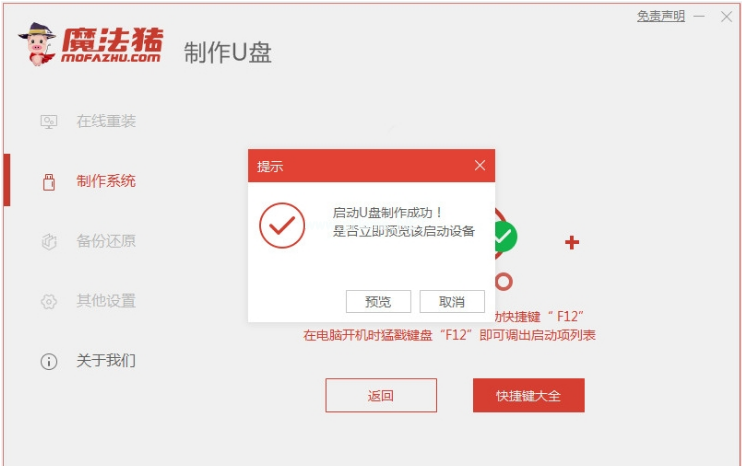 3.等待軟件制作u盤啟動盤,預(yù)覽需要安裝的電腦主板的啟動熱鍵,再拔除u盤退出。