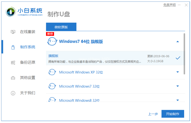 2、選擇win7操作系統(tǒng),點(diǎn)擊開始制作。