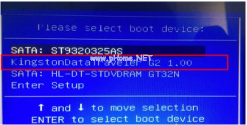 2、彈出啟動菜單,選擇第二項,即顯示u盤名詞或者usb類型字眼的選項,這里是“KingstonDataTraveler G2 1.00”,回車即可進入u盤啟動。