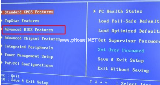 1、同樣開機重啟電腦,使用啟動鍵進入bios界面,選擇“Advanced BIOS Features”,回車。