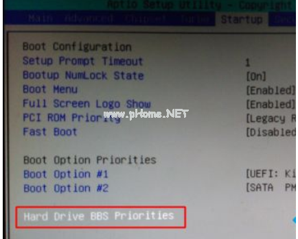 4、如果是以下界面,切換到Boot或Startup,選擇“Hard Drive BBS Priorities,回車。