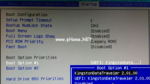 5、接下來選擇Boot Option #1回車,選擇U盤選項,回車即可將u盤設置為第一啟動,按ESC返回,按F10保存重啟即可。