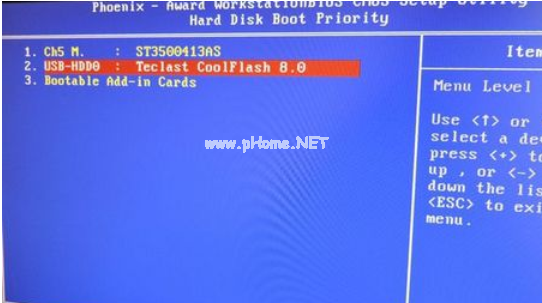 3、選擇USB-HDD按加減號或F5/F6或PageUP/PageDown,移動到第一位置,按F10回車重啟。