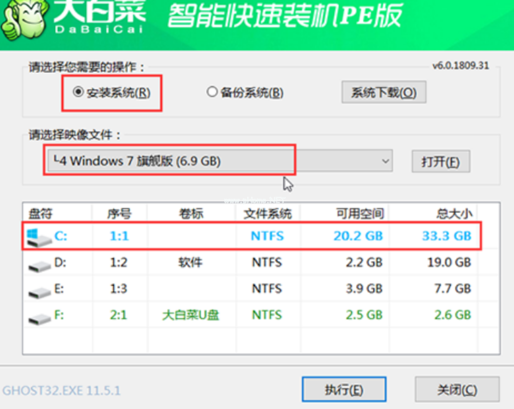 3、在桌面上找到并打開大白菜一鍵重裝,進入重裝界面后,選擇“安裝系統(tǒng)”,選擇已下載的win7鏡像系統(tǒng)作為“映像文件”,勾選安裝路徑為“C盤”,最后點擊“執(zhí)行”。