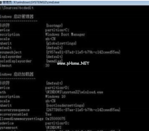 4、在進(jìn)入的命令提示符頁(yè)面后,輸入【bcdedit】點(diǎn)擊回車執(zhí)行命令,之后記錄下【resumeobject】的字符,也就是我們修復(fù)對(duì)象的標(biāo)識(shí)符。
