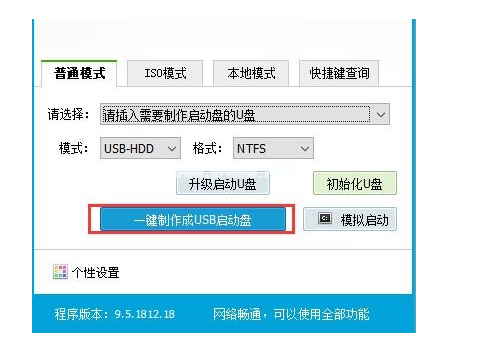 3.選擇普通模式選項卡,“請選擇”中選擇自身U盤設備名稱(一般會自動識別)。模式選擇USB—HDD,格式選擇“NTFS”。
