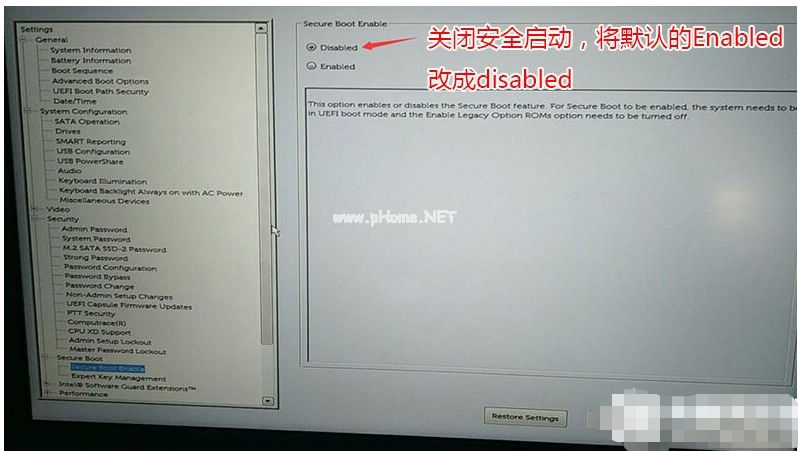 5、閉安全啟動(dòng),操作步驟如下,切換到secure BOOT頁面,選擇secure Boot Enable按回車改成Disabled,關(guān)閉安全啟動(dòng)。