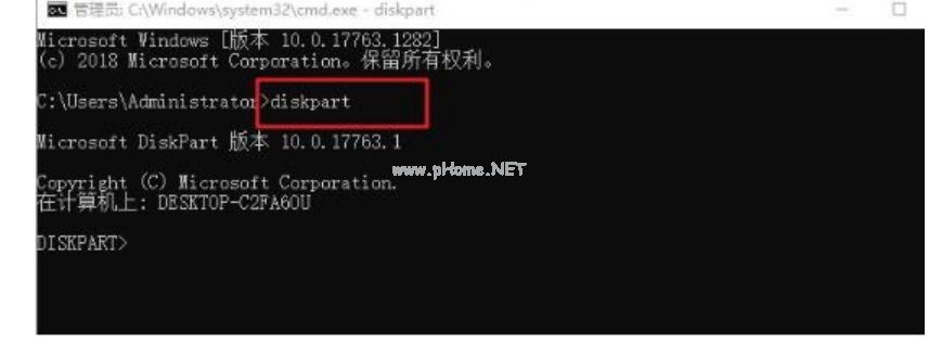 2、 然后在命令提示符界面輸入“diskpart”命令并回車。