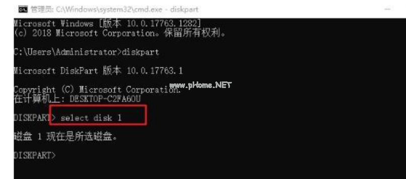 5、打開(kāi)命令提示符界面,在打開(kāi)的命令提示符中DISKPART的右側(cè),繼續(xù)輸入命令“select disk1”敲回車。