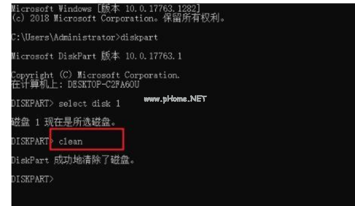 6、 選擇磁盤1,也就是u盤后,在DISKPART右側(cè)繼續(xù)輸入命令“clean”回車,清除u盤信息。