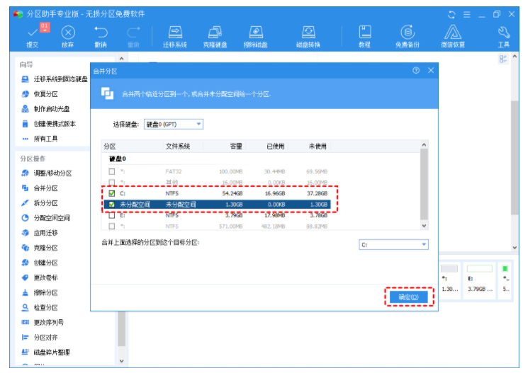 4. 勾選“C盤”和“未分配空間”,并單擊“確定”。