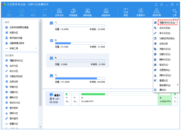 1. 打開(kāi)傲梅分區(qū)助手。右鍵單擊E盤,然后選擇“調(diào)整/移動(dòng)分區(qū)”。